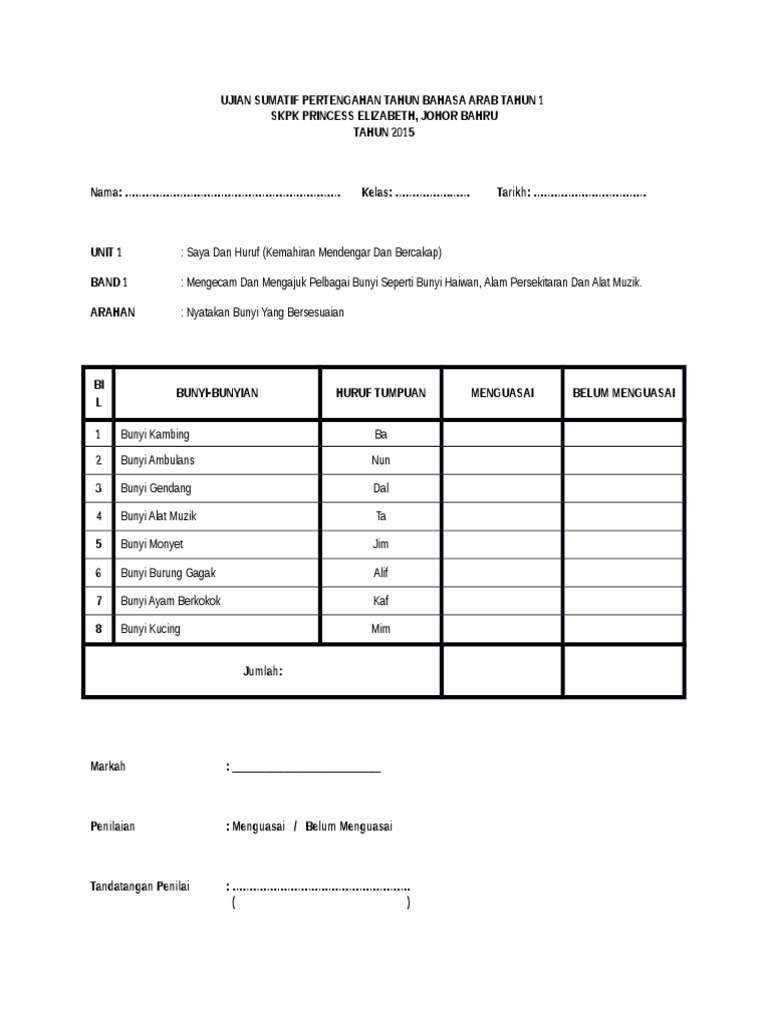 Proses mengesan perkembangan , kebolehan, kemajuan dan pencapaian murid secara menyeluruh berasaskan matlamat kssr & fpk. Angka atau nomor termasuk kata yang sering digunakan dalam berkomunikasi. Sumatif bahasa arab tahun 2015. Mulai tahun 2016 penilaian murid tidak lagi memfokuskan kecemerlangan akademik sahaja, tetapi turut melihat. Carta pelaksanaan pksr bahasa arab memulakan tajuk baru p&p berpandukan kssr/hsp pksr dijalankan secara p&p berpandukan buku berperingkat teks/aktiviti tindakan susulan penilaian secara menyeluruh tindakan susulan bahagian pembangunan kurikulum.